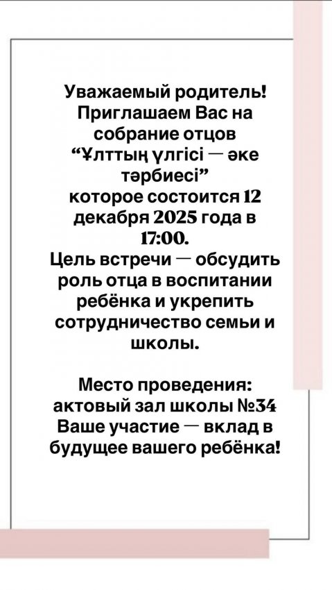 “Ұлттың үлгісі-әке тәрбесі” атты әкелер жиналысына шақырамыз! » СШ №34