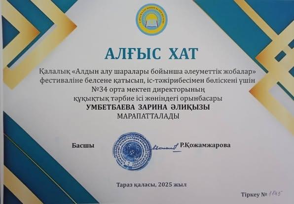 Қалалық «Алдын алу шаралары бойынша әлеуметтік жобалар» фестиваліне белсене қатысып, іс-тәжірибесімен бөліскені үшін №34 орта мектеп директорының құқықтық тәрбие ісі жөніндегі орынбасары Умбетбаева Зарина Әлиқызы Тараз қаласы білім бөлімінің Алғыс хатымен марапатталды.