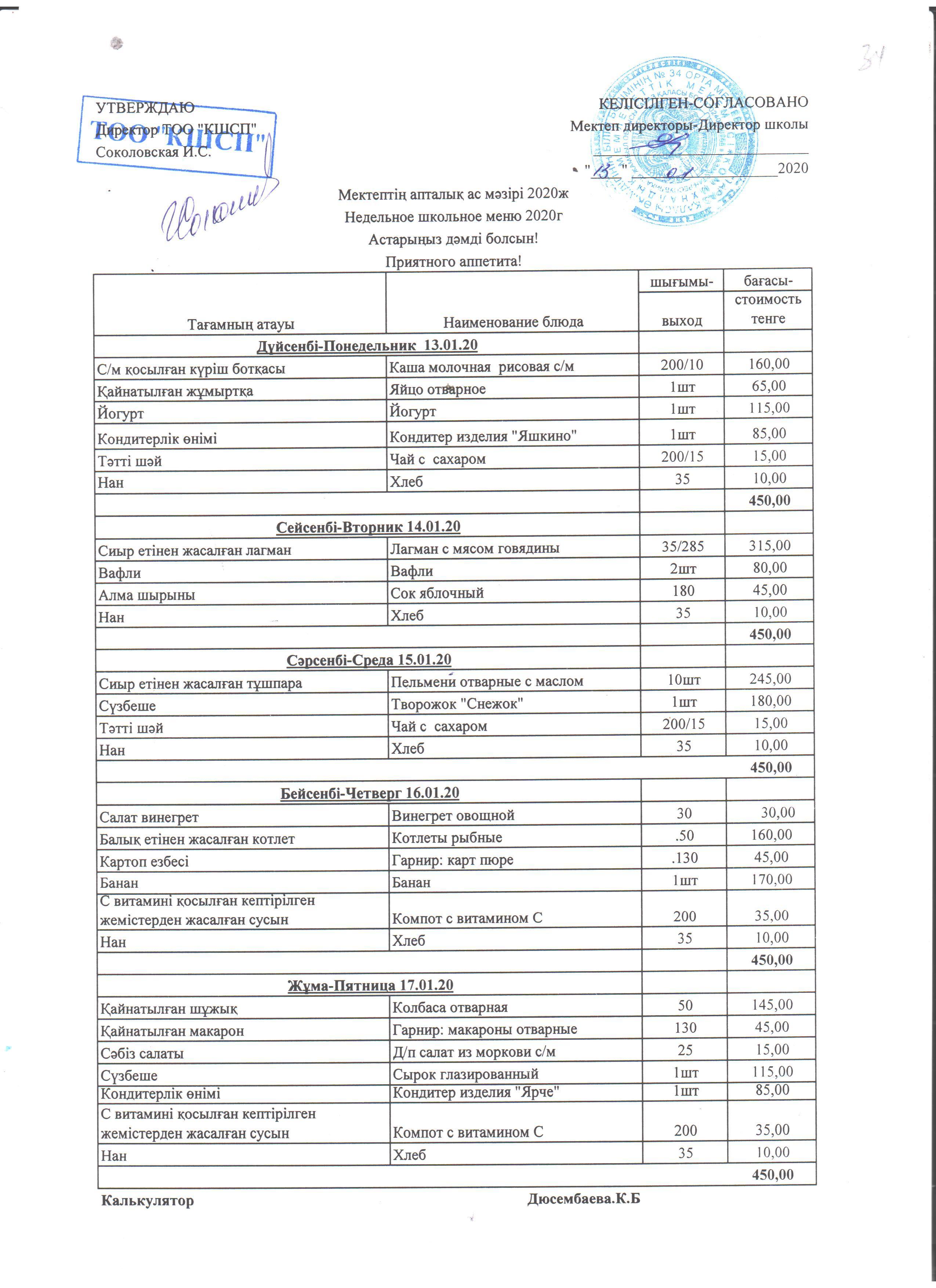 Недельное школьное меню 2020г » СШ №34
