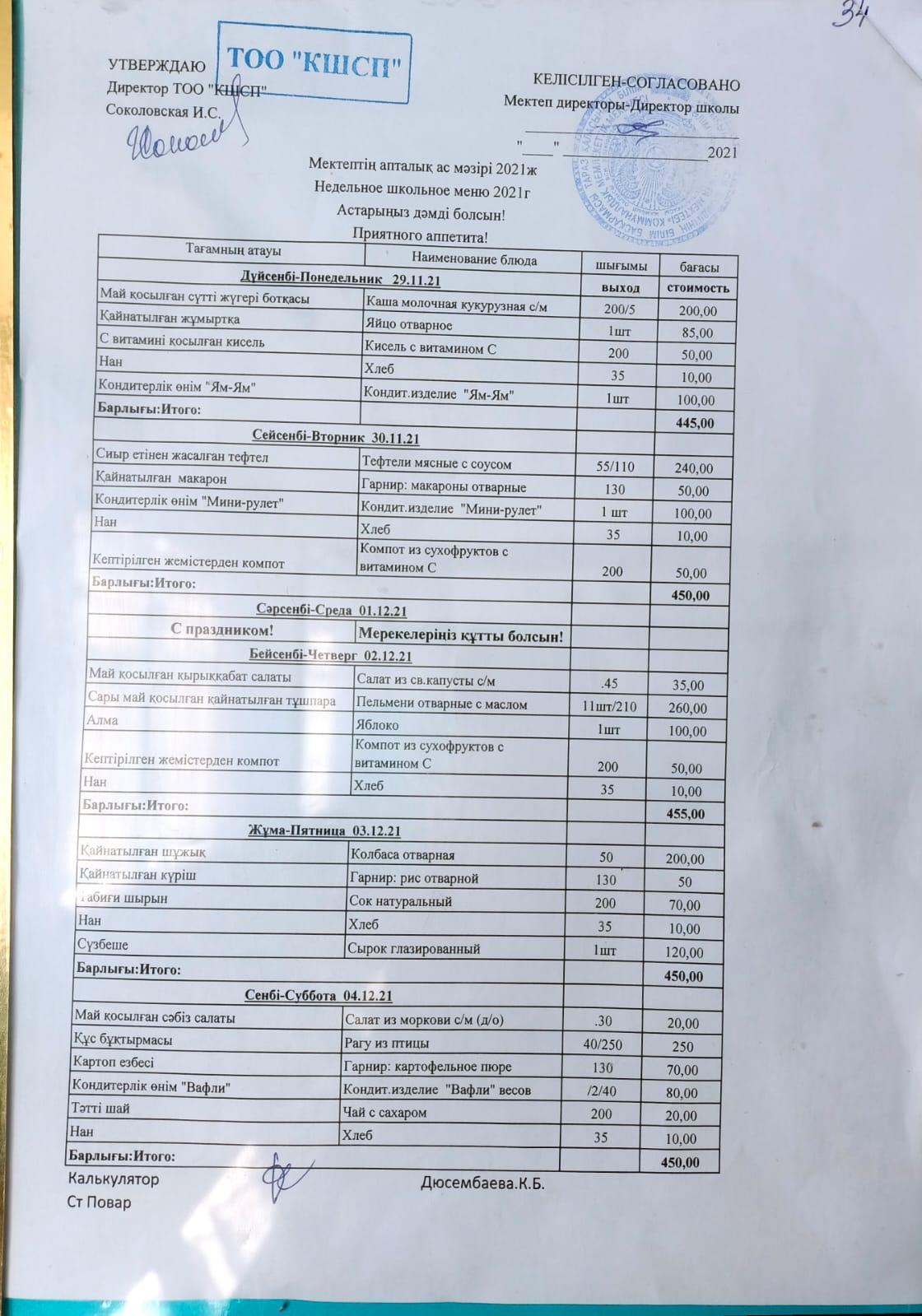 Мектептің апталық ас мәзірі 29.11-04.12.2021 жыл » СШ №34