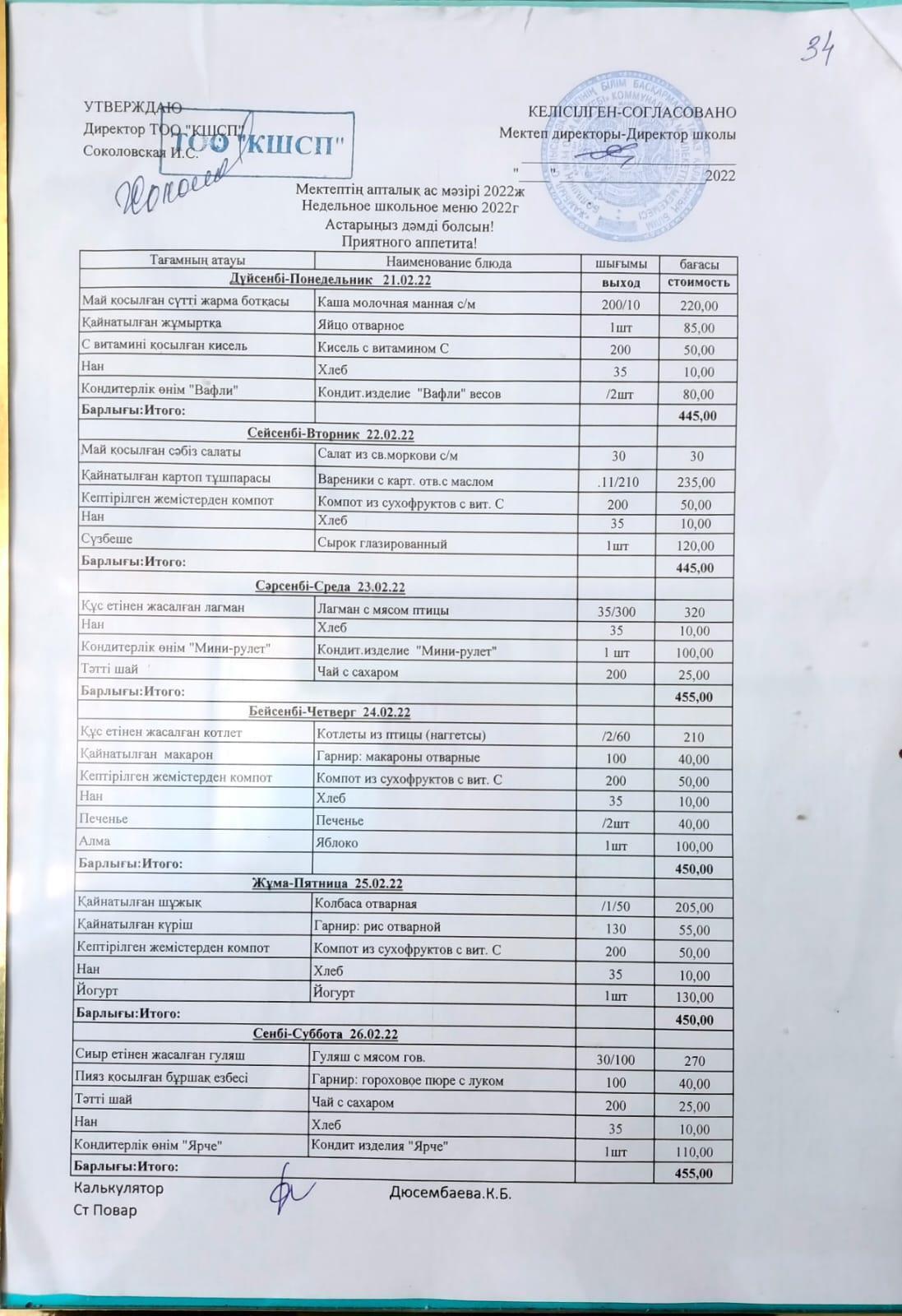 Мектептің апталық ас мәзірі! 21.02.-26.02.2022ж » СШ №34