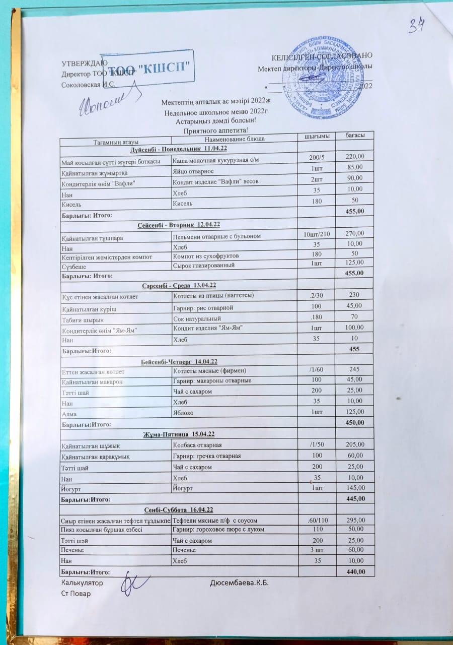 Мектептің апталық ас мәзірі! 11.04.-16.04.2022ж » СШ №34