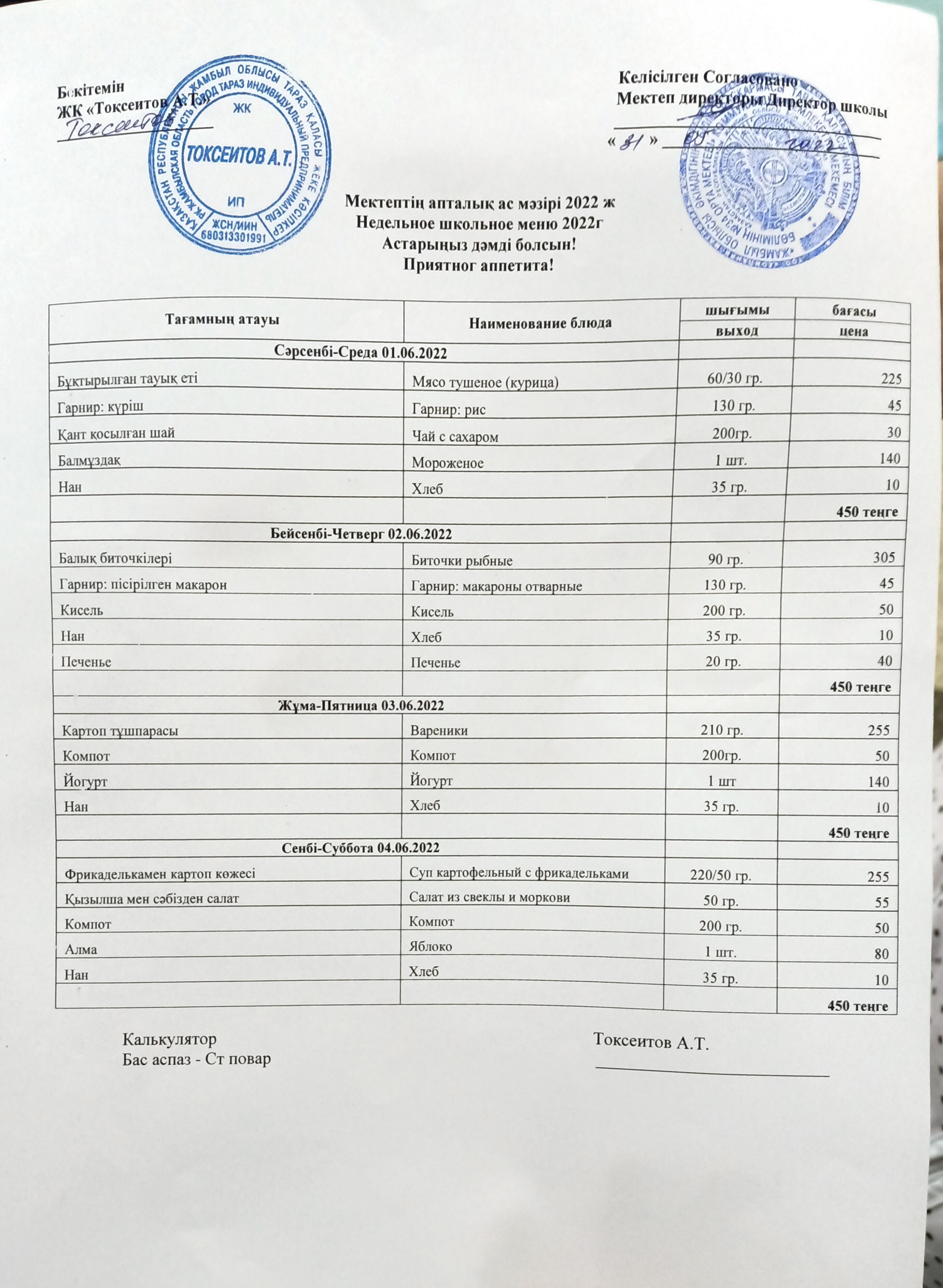 Мектептің апталық ас мәзірі! 01.06.-04.06.2022ж
