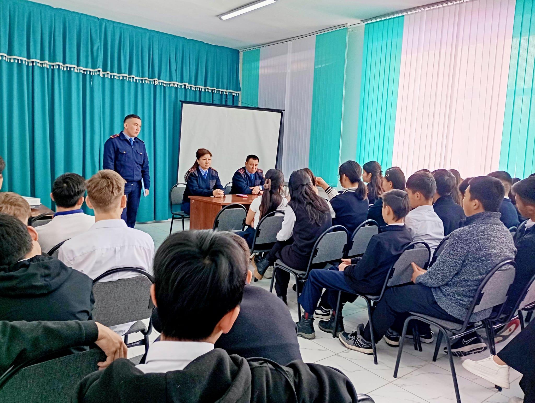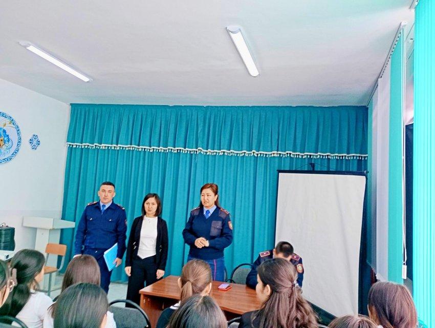 Жамбыл облысы Полиция Департаменті Есірткі қылмысына қарсы іс-қимыл басқармасының аға жедел уәкілі полиция майоры Каукешова Айгерім Асанқызы, Жамбыл облысы Полиция Департаменті Есірткі қылмысына қарсы іс-қимыл басқармасының аға жедел уәкілі полиция майоры Сухарев Андрей Викторович, ПБ 2-ПБ ЖПҚБ ЮПТ УПИ полиция лейтенанты А.К.Абдралиев оқушыларға жиын барысында есірткіге қатысты қылмыс пен құқық бұзушылықтардың алдын алу шаралары жайында сөз қозғады. Тәртіп сақшылары жас буынды әрқашан салауатты өмір салтын ұстанып, спортпен шұғылдануға, теріс әрекеттерге бармауға шақырды. Әрбір құқық бұзушылықты жасаған жан жазасыз қалмайтындығы, сондықтан заңға сай талаптарға бағынып, жарқын өмір сүру керектігі ұғындырылды. Жалпы іс-шара барысында «ғасыр дерті» саналған есірткіден аулақ жүру ескертіліп, түрлі өмірлік өнеге болатын ақыл-кеңестер айтылды.