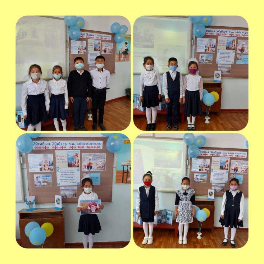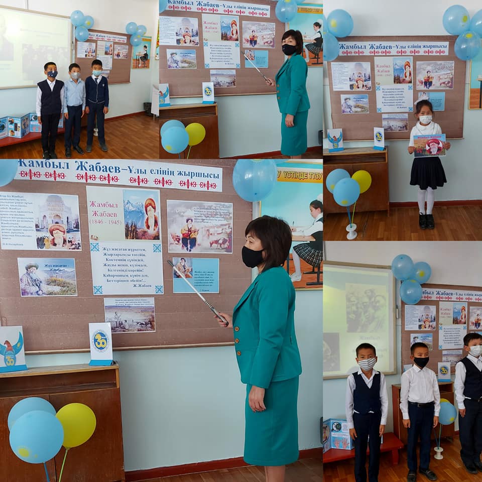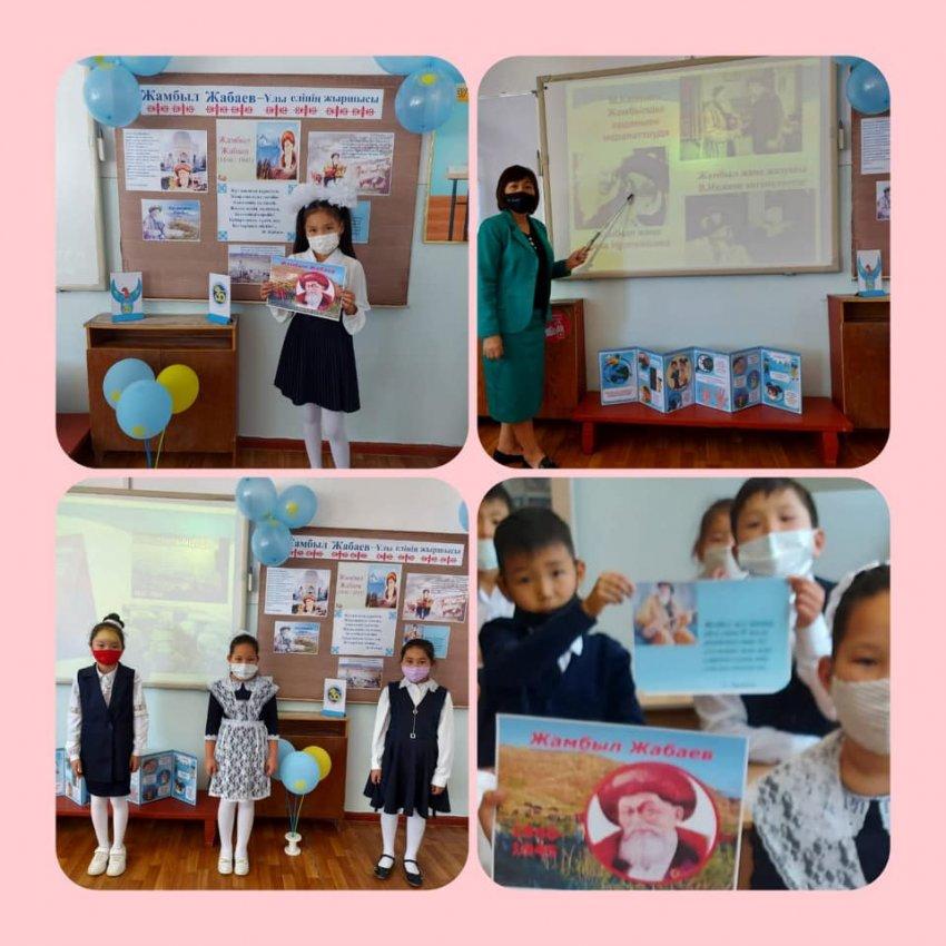 Қазақ халық поэзиясының әйгілі тұлғасы, өлең сөздің дүлдүлі Жамбыл Жабаевтың туғанына биыл 175 жыл толуына орай «Жамбыл Жабаев – Ұлы елінің жыршысы» тақырыбына сынып сағаттары ұйымдастырылды.