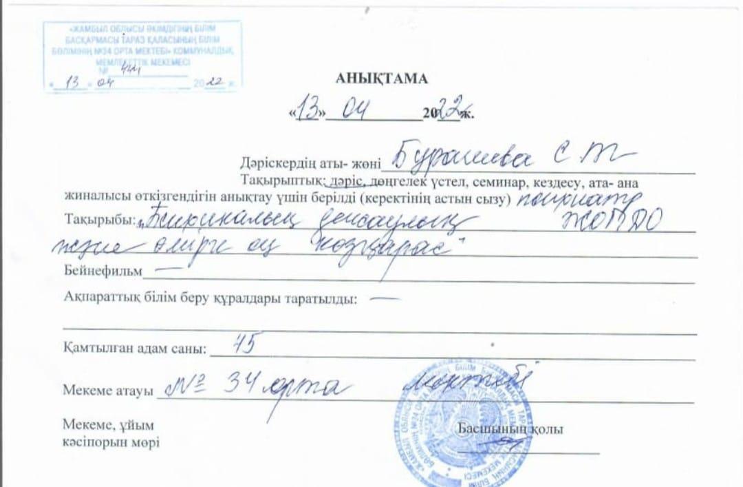 2022 жылдың 13 сәуірінде "Психикалық денсаулық және өмірге оң көзқарас" тақырыбында, Жамбыл облыстық психикалық денсаулық орталығының психиаторы С.Т.Бурашева жоғарғы сынып оқушыларына дәріс оқыды. » СШ №34