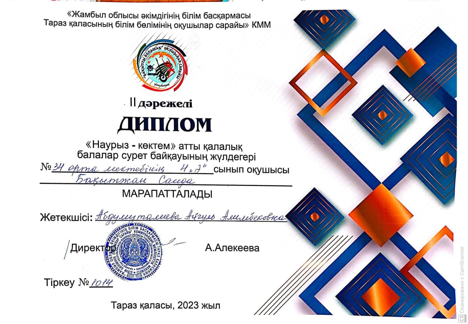 Наурыз - көктем» атты қалалық балалар сурет байқауының жүлдегері №34 орта мектебінің 4 «Ә» сынып оқушысы Бақытжан Саида ІІ дәрежелі дипломмен марапатталды. » СШ №34