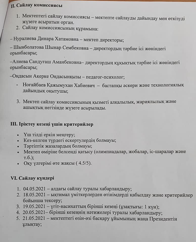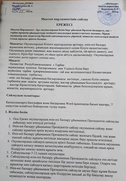 Құрметті, мектептің оқушылары! Бізде мектеп президентінің сайлауы өтеді, осы сайлауға өз еріктеріңізбен қатысқыларың келсе, ережемен мұқият танысып, қатысыңыздар.