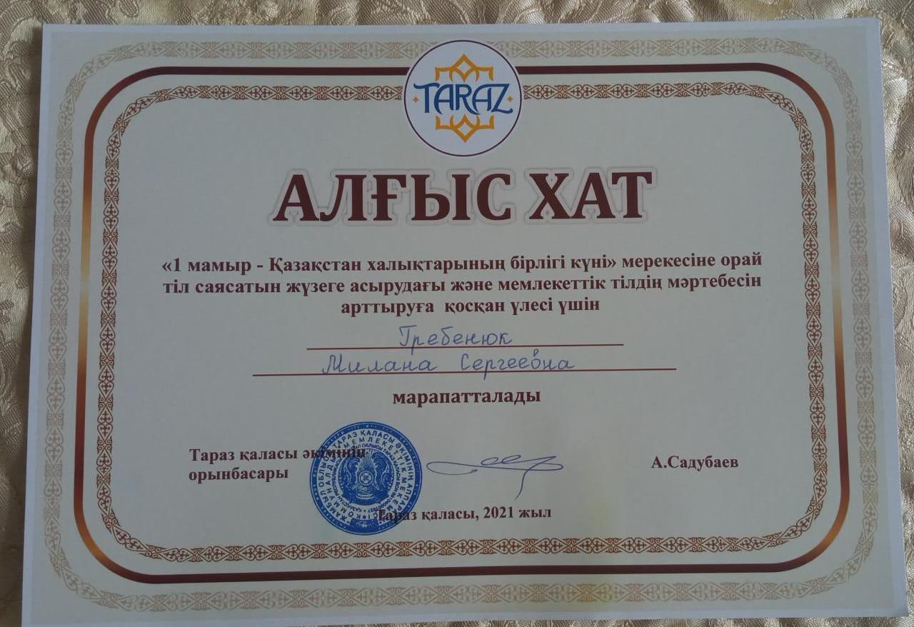 №34 орта мектептің 9 сынып оқушысы Гребенюк Милананы "1 мамыр - Қазақстан халықтарының бірлігі күні" мерекесіне орай тіл саясатын жүзеге асырудағы және мемлекеттік тілдің мәртебесін арттыруға қо