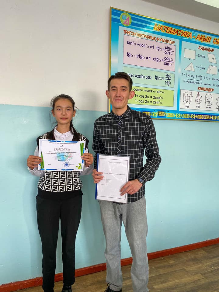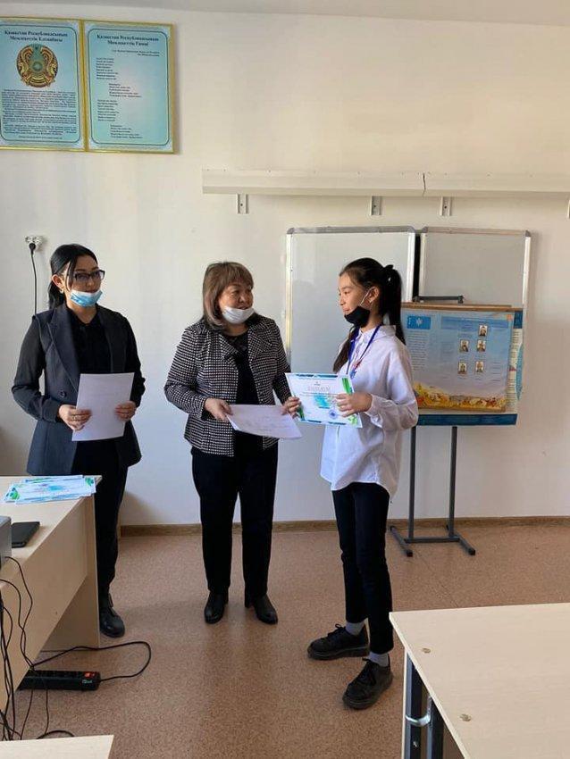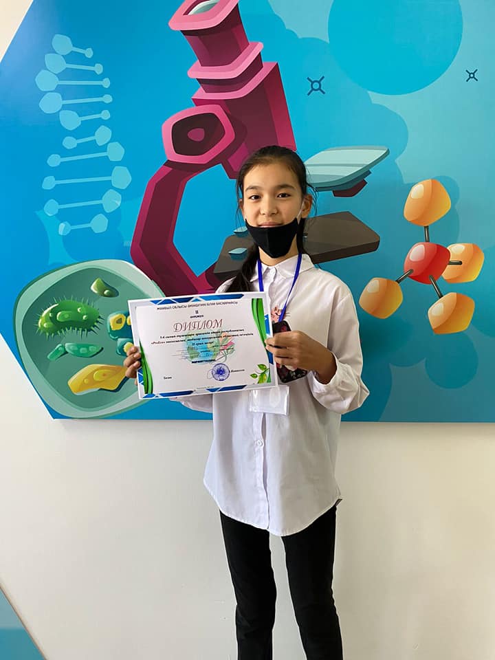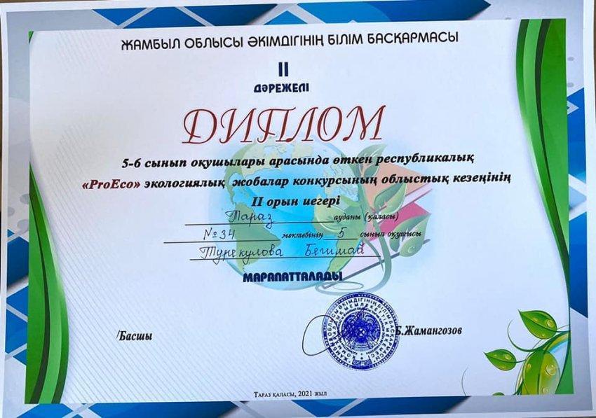 5-6 сынып оқушылары арасында өткен республикалық «ProEco» экологиялық жобалар конкурсының облыстық кезеңінің ІІ орын иегері 5 «А» сынып оқушысы Турекулова Бегимай. Жетекшісі: Унгаров Ш.Е. ЖЕҢІСТЕРІҢІЗ ҚҰТТЫ БОЛСЫН!!!