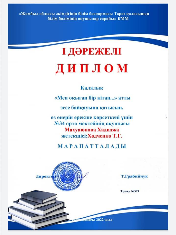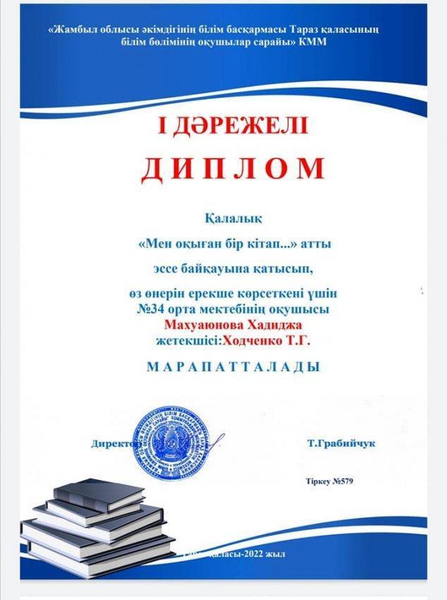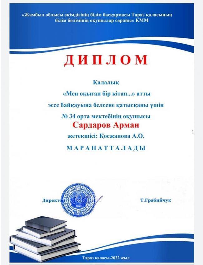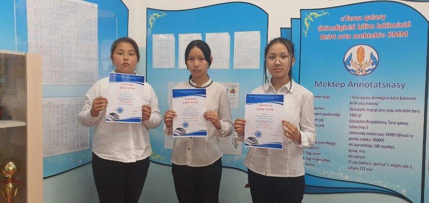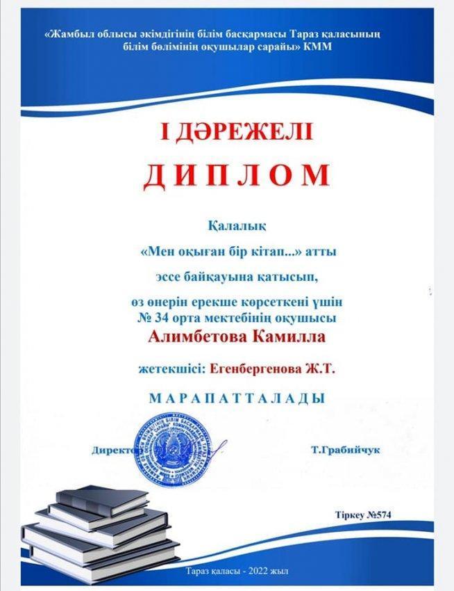 "Мен оқыған бір кітап" атты қалалық эссе жазу байқауына қатысып, өз өнерін ерекше көрсеткені үшін оқушыларымыз Алимбетова Камилла, Махуаюнова Хадиджа, Марасулова Асаль, Сардаров Арман 1,2 дәрежелі дипломдармен марапатталды. » СШ №34