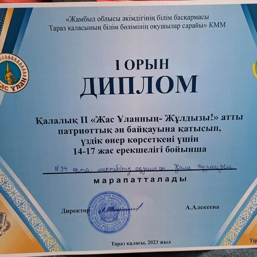 ❇️Қалалық ІІ «Жас Ұланның – Жұлдызы!» атты патриоттық ән байқауына қатысып, үздік өнер көрсеткені үшін 14-17 жас ерекшелігі бойынша №34 орта мектебінің 10 сынып оқушысы Қали Нұрайдем І орын иеленді. ЖЕҢІСІҢ ҚҰТТЫ БОЛСЫН🌷🌷🌷 » СШ №34