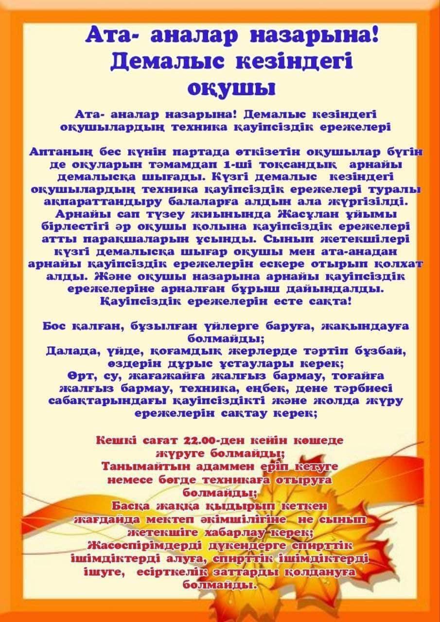 29 октябрь 2024 0 1 2 3 4 5 🔰Тараз қаласы #34 орта мектебінің оқушылар мен ата-аналар чаттарына "Күзгі каникул кезіндегі қауіпсіздік ережелері" бойынша жадынамалар таратылды.
