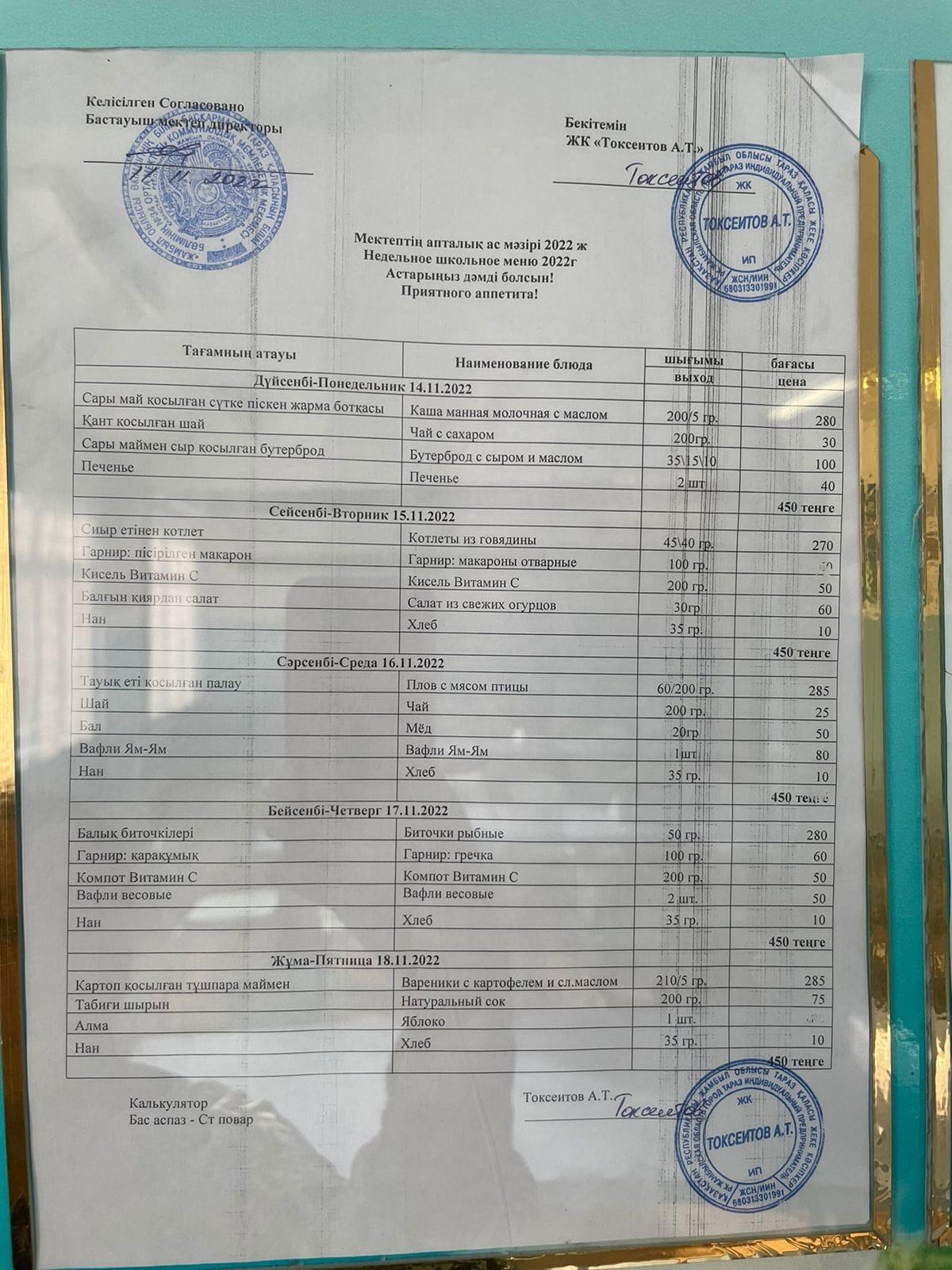 Мектептің апталық ас мәзірі! 14.11-18.11.2022ж