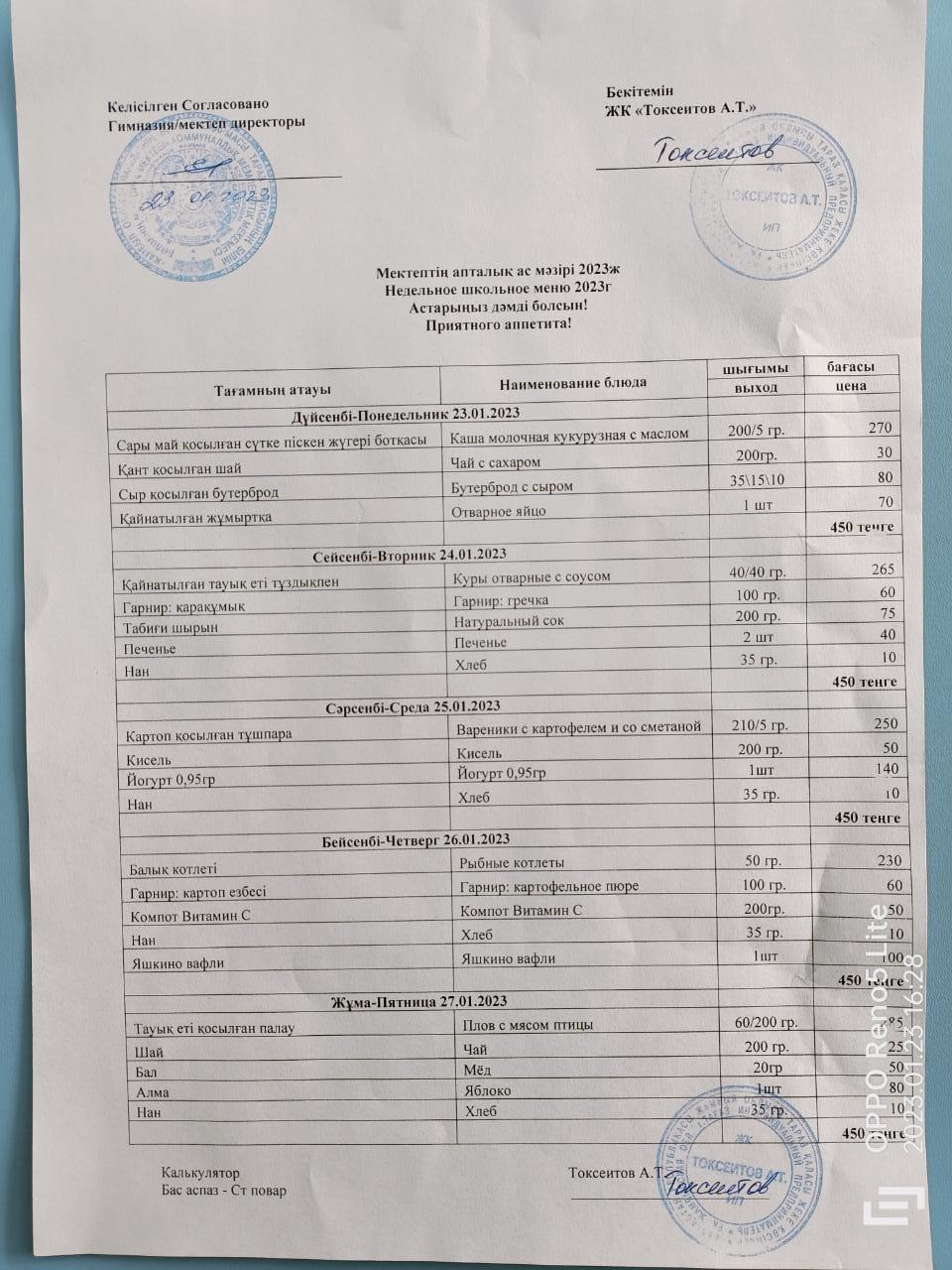 Мектептің апталық ас мәзірі! 23.01-27.01.2022ж
