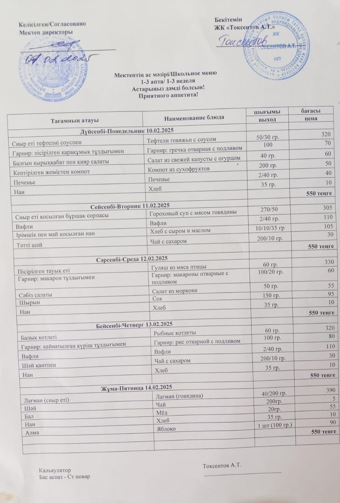 Мектептің апталық ас мәзірі!